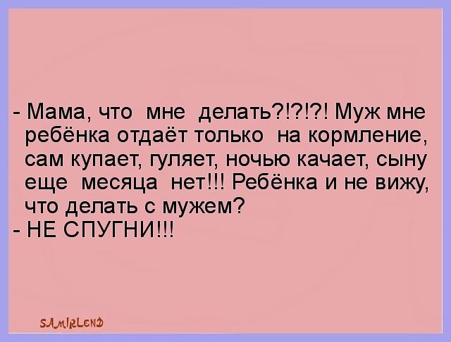 поначалу муж делал все, что попросишь, сам в принципе не проявлял инициативу, а теперь сын уже сам знает что ему надо) И заставляет папу.У нас еще папа с работыдомой приходит в 9 вечера. В выходные оствалася один на один с ребенком часто, но ненадолго, т.к. ребенок на ГВ был. Сейчас же может остаться с ним на весь день