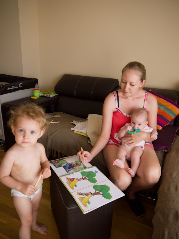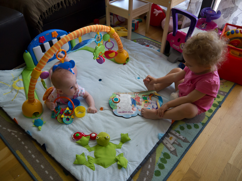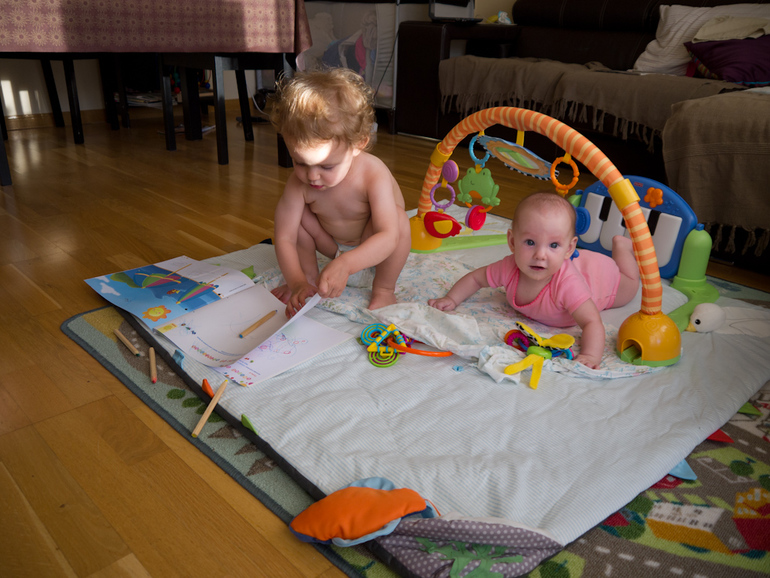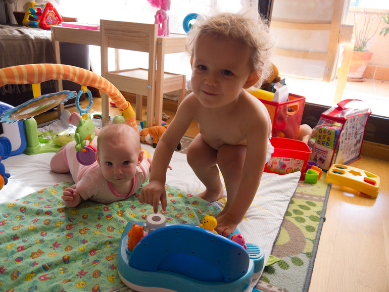 В целом все хорошо)). Девчата все больше общаются, мы с мужем все спокойнее относимся к приступам ревности и другим капризам старшей, младшая растет, больше бодрствует и стремится с каждым днем все больше участвовать во всем, что происходит в семье.