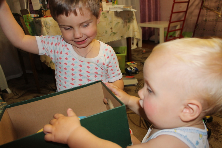 Ну вообще, жадность победила ревность: Серёга часто стал просить меня, чтобы я взяла Митю на ручки - лишь бы не лез к его игрухам.