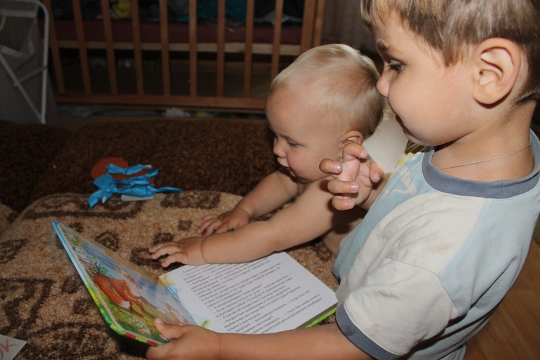Я уже как-то описывала наши "занятия" с Серёгой, когда Митя не спит... Честно говоря, старший брат мало чем отличается в этом отношении от младшего: когда я пытаюсь поиграть вместе с Митрием, как правило, приходится в итоге играть с обоими - и в то, что интереснее Серёге. Я, с одной стороны, рада, что мы как бы все вместе, дружно, но, с другой - отдельных занятий с Митей тоже хочется, и жалко бывает, когда вот-вот поймала его внимание, вроде заинтересовался - и тут вмешивается Сергей :-(