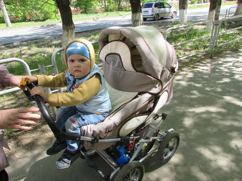 Гуляю чаще всего с ними одна, выхожу на сон младшего..Вот так мы катаемся если сильно устал, обычно гуляем долго и далеко от дома. Сынуля спокойно переносит дальние прогулки. А, ну да, на ногах у младшего он НЕ сидит!!