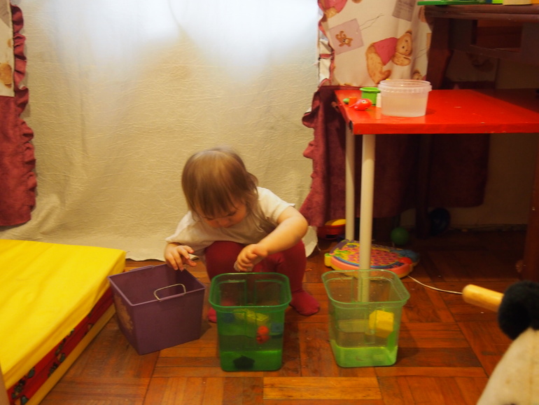 Как у меня обычно развлекается младшая, когда Ваня в садике: лепит из пластилина с формочками, играет с кинетическим песком, рисует, собирает пазлы, играет в Падающие обезьянки. Я тоже дома работаю, Маруся привыкла уже занимать сама себя) С водой тоже очень любит возиться, прям час может у раковины стоять, что-то переливать, мыть.
