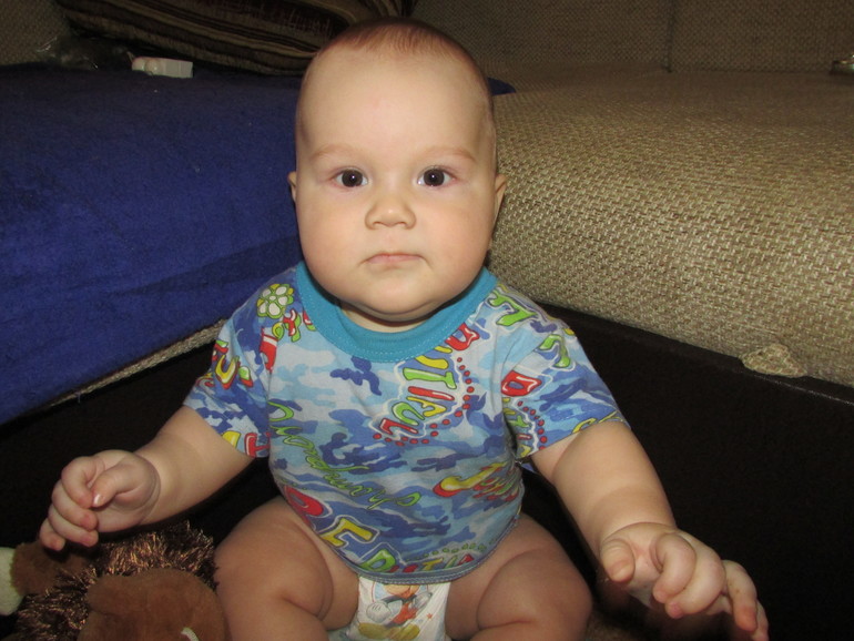 Кирюша. Мой сладкий кабачок.. Рост в 7 мес 78 см, вес -12300. Сидит, переворачивается, крутиться во все стороны, может долго стоять на четвереньках, но не ползает.. Пока стоим и качаемся. Прикорм кушает мало, в основном грудь. Для меня это сюрприз, т.к. Артем прикорм лупил за обе щеки.