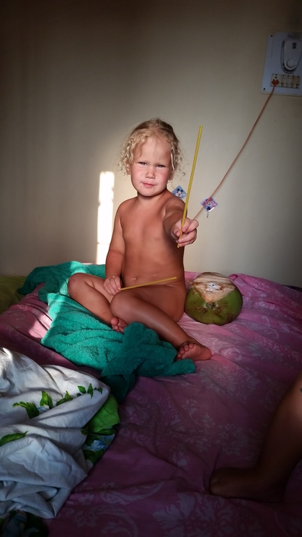 В 12 приходим домой, сразу в душ. После просим у Бенни (хозяина нашего дома) кокос. Бенни держит палатку с фруктами, и приносил кокосы прямо домой)