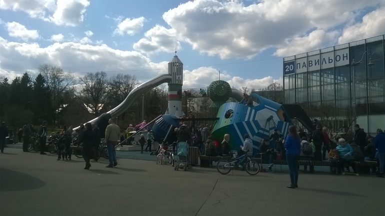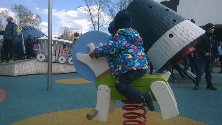 Когда мы вышли из музея, дети заснули) и мы пошли гулять на ВДНХ)) Выпили с мужем кофе, пока дети спали. Погода была очень хорошая, солнечная) В продолжение космической темы решила сводить Федю на . Но там было очень много детей (было воскресенье) и даже на небольшие горки пускать такого маленького ребенка было страшно. На наш возраст там только собаки-качалки и луноход.. Задержались мы там ненадолго и пошли гулять дальше.