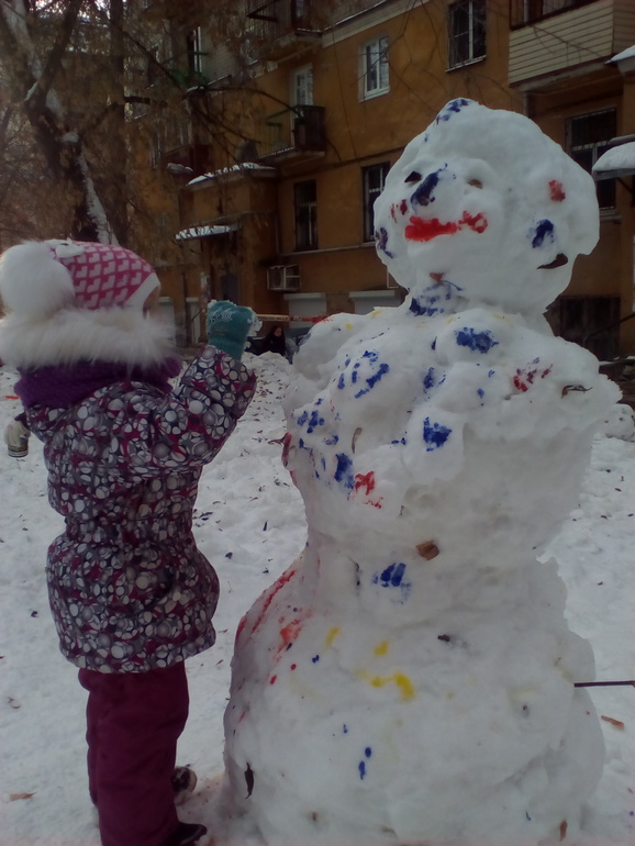 Вот так гуляем)) гуаш с водой и кисточки. Маме влажные салфетки. Вчера слепили, сегодня раскрасили. Завтра в бутылки краску разведу, пойдем сугробы раскрашивать. 2,5 часа рисовали только! Угулялись нехочу)