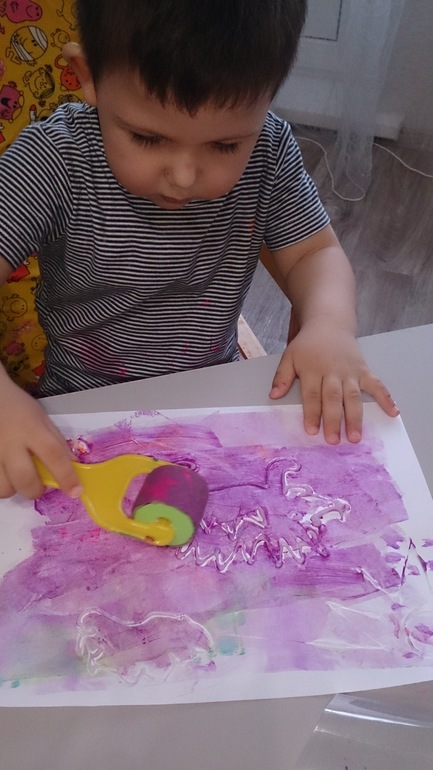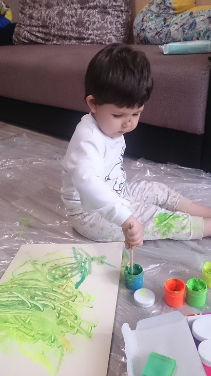 Ну и конечно мы рисуем, рисуем в основном на полу, ибо холст маловат и продолжаем на столе, стульях и прочих, мама придумала стелить клеенку - в итоге все довольны дома чисто и совеныш рисует где хочет :)