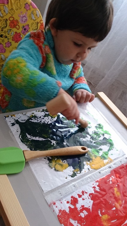 А это краски в файле + блестки + масло, в итоге цвета причудливо смешиваются, а вокруг чисто! 30 минут свободы для мамы!