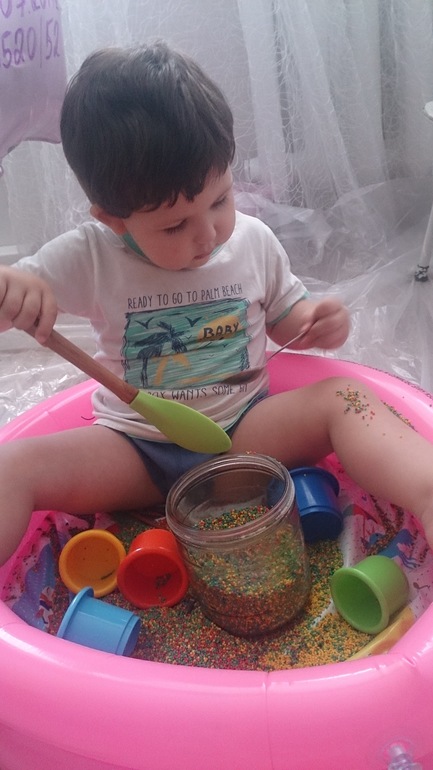 После этой развивашки приходитс долго убирать))))) но Тише очень нравится крашеное пшено пересыпаем в разные емкоси, закапываем фигурки, потом ищем, смешиваем цвета и много-много чего