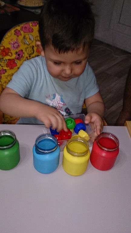 Вот так мы учим цвета, раскладываем крышечки (и другие мелкие предметы - у нас есть овощи еще советских времен) в баночки соответствующего цвета
