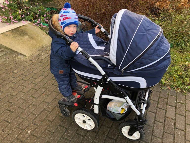 Илюша поначалу очень обижался, что в коляске едет Алёна, а не он, плакал. Но потом мы купили подставку, и ему вроде понравилось ездить на ней. сегодня долго гуляли, далеко ушли (я больше всего как раз не хотела гулять только возле дома, мне так неинтересно).