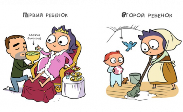 Комната погодковНашла классные картинку художницы Ванг Чен о том как изменилось её материнство со вторым ребёнком.