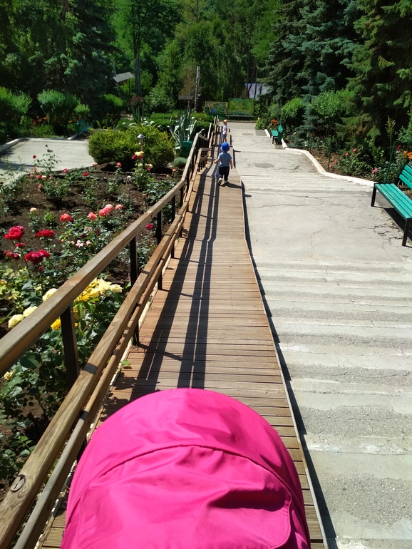 Илья по крутым длинным ступеням ускакал вниз к огроженному сеткой пруду с птицами. Спустила Мишку на руках, поднялась за коляской (спасибо, что она весит 4 кг), тоже спустила.