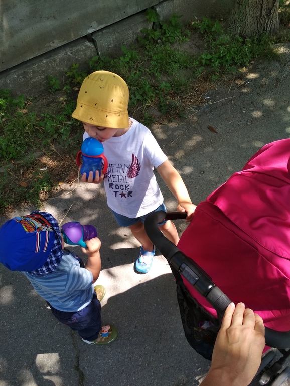 Лешу покормила, Леша покакал. Понимаю, что взяла всё, кроме памперса. Миша от сладкой ваты отказывается, не понравилась пышная консистенция, Илья говорит, что ему не вкусно, "Мама, съешь ты, мама, держи, мама, ну мама, на". А у меня закаканный Леша. Пошла по мама с колясками в поисках памперса, нашла, поменяла на лавочке под нетерпеливое Илюшино взять сладкую вату. Всё, закончила, Лёшу вернула в эрго, салфетки, бутылочки, все спрятала обратно, забрала у Ильи сладкую вату, качу коляску второй рукой, и Илья капризно выдал, что у него, оказывается, руки липкие, так идти не может, "Мам, дай салфетки, пожалуйста". Аррр. Выбросила вату в мусорку, снова достала салфетки, протерла руки, по крутому пандусу вверх покатила коляску с Мишей, это тяжелее, чем с Лешей, еще и он на груди висит. На улице жара страшная, иду в гору домой и думаю, хоть бы сознание где не потерять с тремя детьми. Дошли, помыла обоих и всем спать.
