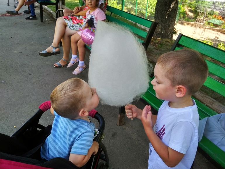 Тут у меня появилось время даже потоптаться на месте и позвонить маме. Но на часах уже 12, а дети в 12:30 ложатся, к 13 уже капризные и неадекватные. Идем на выход, Илья согласен, Миша рогом уперся, ни в какую, мы уже за угол зашли, ему до лампочки. Вернулись, силой оттащила от фонтанчика, посадила в коляску и пристегнула. У выхода Леша заерзал, проголодался. Села кормить, Илья увидел сладкую вату (никогда не ел), попросил. Отправила его разузнать про цены, справился, сказала, как очередь занять, как кого спросить, дала денежку. Все замечательно, как взрослый) Вернулся со сладкой ватой, ели.