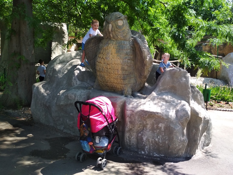 Илья поднялся обратно. Подняла Мишку, спустилась за коляской с Лешей, подняла. Дальше по другим ступеням пошли на самый верх зоопарка с павлинами и прочими птицами. Илья увидел искусственную скалу, залез. Мишка увидел - ему тоже надо, ручки тянет, мол, "мам, подними". Подняла, постояли довольные, попытался карабкаться дальше - не смог, "мам, спусти на землю", спустила. С другой стороны пищит Илья, "мам, я залез на сову, слезть боюсь".
