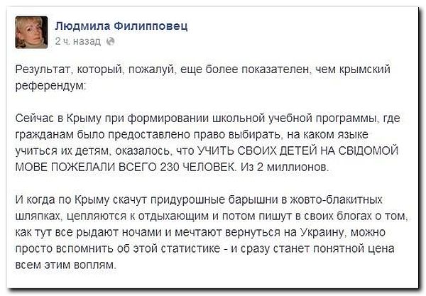 В итоге, практика на деле показала, что украинский язык, если его не пытаются навязывать людям насильно, тут нафиг никому был не нужен. Как всегда говорили местные сепаратисты, Крым это не Украина, поэтому ситуация с языком лишний раз подтверждает их правоту. О каком возвращении Крыма в состав Украины может идти речь, если люди даже язык украинский де-факто не нужен.