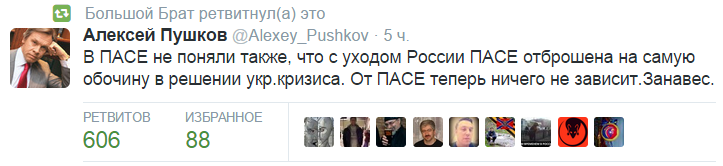 А с кем теперь они мирные урегулирования в Украине будут обсуждать? Ведь они не имеют никаких средств давления на ополчение в отличие от РФ. Ну и как говаривал Задорнов, есть антифашисты, есть антисемиты, а есть борцы за права человека. Так вот как раз ПАСЕ и пасет этих борцов и через международные суды и оказывает давление на неугодные страны или компании. Поэтому выход РФ из ПАСЕ, более чем логичен, но произошел он типа по инициативе, "любителей прав человека". Мне на самом деле другой вопрос покоя не дает, а именно: "Сколько живых бойцов выйдет из котла под Дебальцево"? Как-то все так складывается, что похоже очень мало оттуда выйдут на своих ногах. Одним словом, как бы боком такое не вышло, если там тысяч 6-7 людей положат.