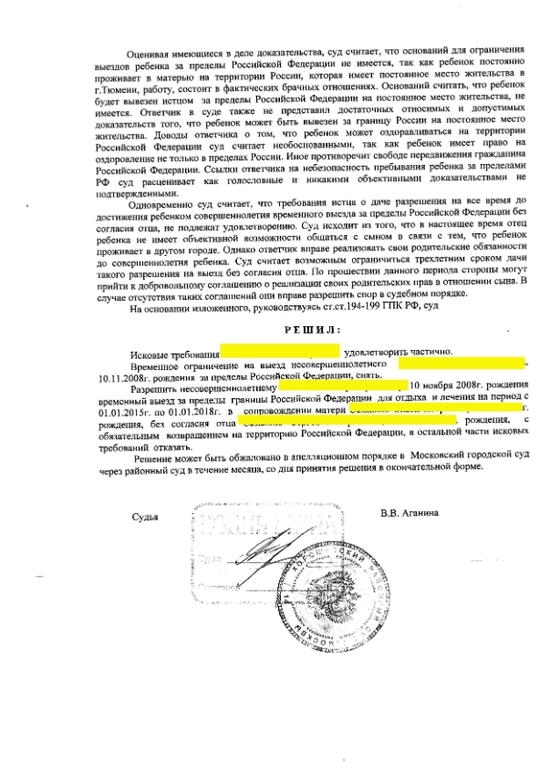 1. Снять временное ограничение на выезд за пределы Российской Федерации несовершеннолетнего Семашко Ивана Сергеевича, 10.11.2008 года рождения.