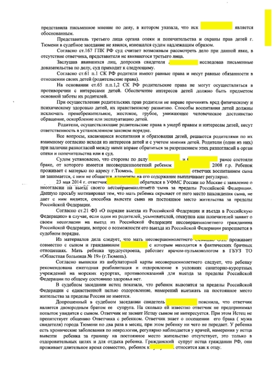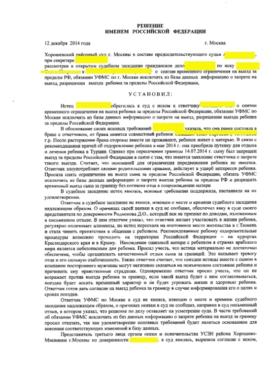 Необходимо отметить, что с момента расторжения брака по 14.07.2014 г. о наличии ограничений на выезд ребенка из России мне не было сообщено ни ответчиком, ни УФМС России по г. Москве. В противном случае я бы не пыталась вывезти сына на отдых и лечения из Российской Федерации, чтобы не причинять ему нравственных страданий.