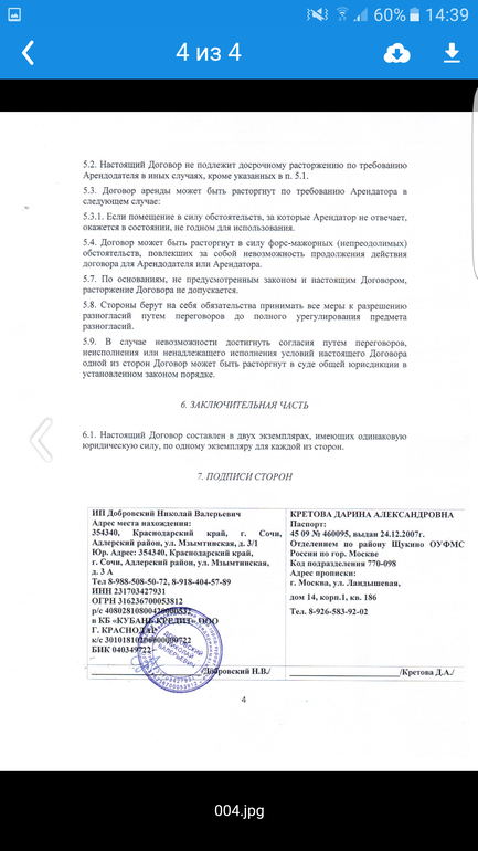 Жилищное (оформление, прописка, приватизация)Добрый день! Попала по своей беспечности в не приятную ситуацию ( искала квартиру в адлерп на 1.5 месяца, нашла, при разговоре все отлично все хорошо, очень приятная и понимающая женьщина! Прислала мне договор, но я честно говоря даже не особо читала, прислала мне его по электронной почте, подписи я нигле никакие не ставила!