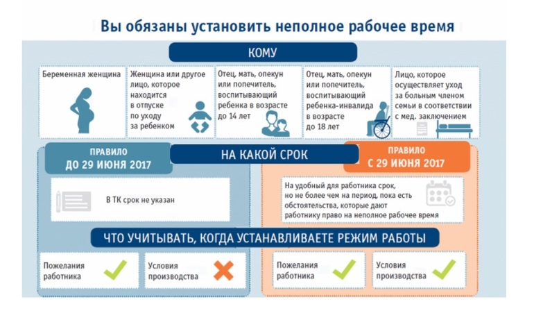 Как было раньше. Сотрудник, который имел право на неполное время, сам выбирал график работы. Повлиять на это вы не могли. + Кроме того, ТК не требовал и компании не устанавливали срок, на который вводили неполное время. Это приводило к тому, что сотрудник продолжал работать неполное время и после того, как прекращались обстоятельства, которые дали на это право. Отменить неполное время можно было только с согласия работника. Как теперь. Если устанавливаете неполное время сотруднику, который имеет на него право, можете ограничить срок, в течение которого он будет работать на таких таких условиях. ПРИМЕР Беременной сотруднице устанавливайте неполное рабочее время до окончания беременности. Работнику в отпуске по уходу за ребенком - до окончания такого отпуска. + Устанавливайте режим рабочего времени, в т. ч. продолжительность ежедневной работы, теперь не только в соответствии с пожеланиями работника. Учитывайте условия производства (ч. 2 ст. 93 ТК). ПРИМЕР Сотрудник просит установить неполное время: пять рабочих дней в неделю с 8.00 до 12.00. Вы вправе ему отказать и предложить другой график работы, например, с 10.00 до 14.00, если если совещания, на которых он должен быть, проходят после 12.00. Как извлечь пользу. Проверьте трудовые договоры сотрудников, которым по требованию закона установили неполное время. Если не указали период, на который его вводите, предложите сотруднику его определить в допсоглашении. Чтобы учитывать условия производства, когда устанавливаете режим работы при неполном времени, определите в ПВТР производственные процессы, которые будете учитывать. Это может быть количество сотрудников в подразделении и нагрузка на них, дни и время совещаний, график выпуска продукции и др. Источник: Справочник кадровика