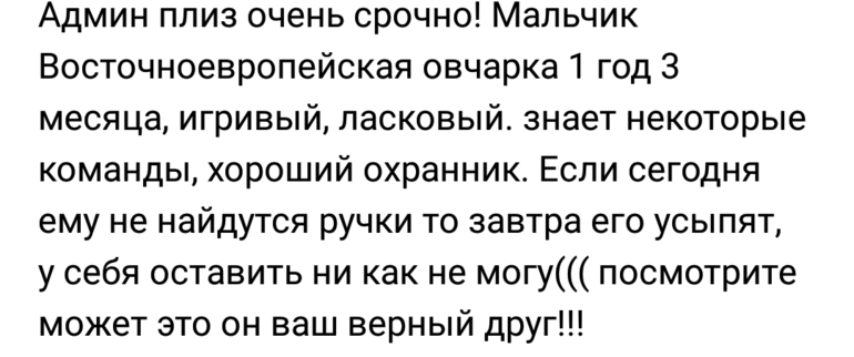 Что имеем за вчерашний день- 2 независимых волонтеров( те, кто отписывались в комментариях в объявлении) вызвались помочь- посмотреть со стороны на реакцию собаки при виде нас. Первыми вошли они- собака отходила, недоверчиво смотрела, грозно лаяла. Смотрели, когда вошли мы- визг, писк, довольный лай и вставание на задние лапы. Из 10 команд подзывает по кличке - 8 положительных. К нам подходил сразу , к женщине, у которой сейчас- на нее не реагирует вообще. Даже к волонтёрам подходил.ну не суть- они видят, что собака к нам более чем расположена, но дама собаку не отдает.а у нас нет прямых доказательств, что это именно наша. Итог- волонтеры более чем на нашей стороне, сейчас идут переговоры с ней, чтобы возместить затраты на содержание (замёрзшая каша) . Ребята, которые нам помогают , говорят ,что пойдем хитрым путем- нам нужен результат, неважно как мы это сделаем... они будут ее обрабатывать, давить на то, что у нас хорошие условия , (а это так и есть), и что она хочет ведь ,чтобы у собаки был хороший дом и уход, будут ее уговаривать, на то, чтобы она отдала собаку нам, а мы, считающие, что собака наша, соответственно будем заботиться о нем , как о рожном. И в данной ситуации выиграют обе стороны. В данном случае полиция мало чем поможет, лично разговаривала с участковым. Когда вернём его, то естественно поедем ставить чип.