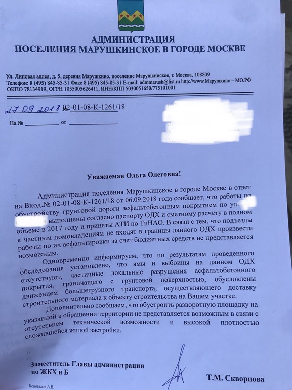 РазноеВ августе 2017 по нашей улице клали асфальт, а до нашего участка не доложили (там лежало куба 4 песка и поэтому они не доделали до конца). В момент укладки асфальта мы были в отпуске. По приезду пошли в администрацию, где нам сказали, что по ген плану дороги там нет и на нас асфальта не хватило(хотя на самом деле они просто «лишний» асфальт до нашего участка пустили на увеличение общей ширины дороги).. Предложили сделать за свой счёт. Площадь асфальтирования примерно 50кв.м. Выставили сумму. Но у нас нет лишних денег) в этом году написала в префектуру ТиНАО и а администрацию. Префектура ещё не ответила, а вот Администрация послала. Есть смысл писать в прокуратуру? Дорога то до нашего участка должна быть! Мы не можем заехать к себе на участок, приходится машину оставлять за забором... ответ Администрации ниже