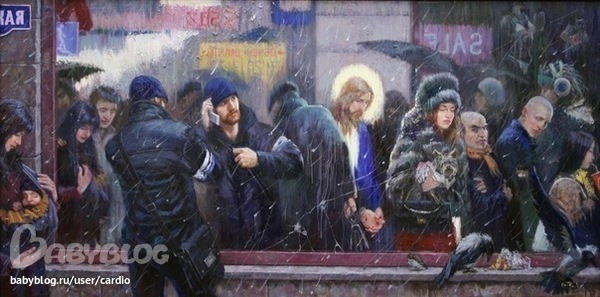 С этого момента мысль о картине почти не оставляла меня. Началась череда поисков. На эскизах были то голуби, то витрины, то какие-то люди. У нас тогда композицию вёл Павел Рыженко, наверно, самый значительный ныне из православных художников. И вот, посмотрев в очередной раз мои эскизы, он спросил: "А что ты хотел передать?"Я ответил. Он выслушал:"Вот и напиши так как сейчас рассказал." Так просто. И так сложно. Но все эскизы вдруг объединились в голове в один единственный. И действительно надо написать так, чтобы было просто и понятно. Так, как оно есть..