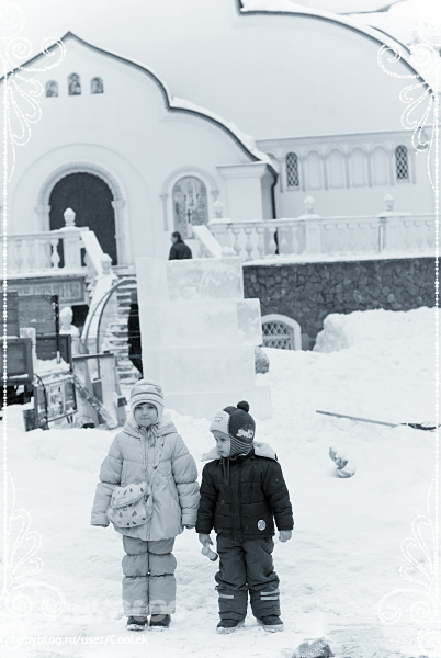 Около Храма в том году был построен ледяной вертеп. У нас с мужем была мысль, что мы сможем ребятам показать и рассказать историю рождения Христа. Как раз час назад они видели фильм. Но, к сожалению (нашему) вертеп только начинали строить.