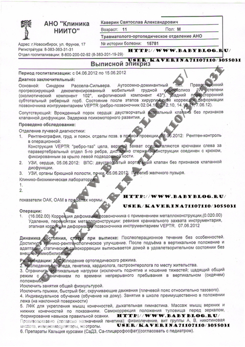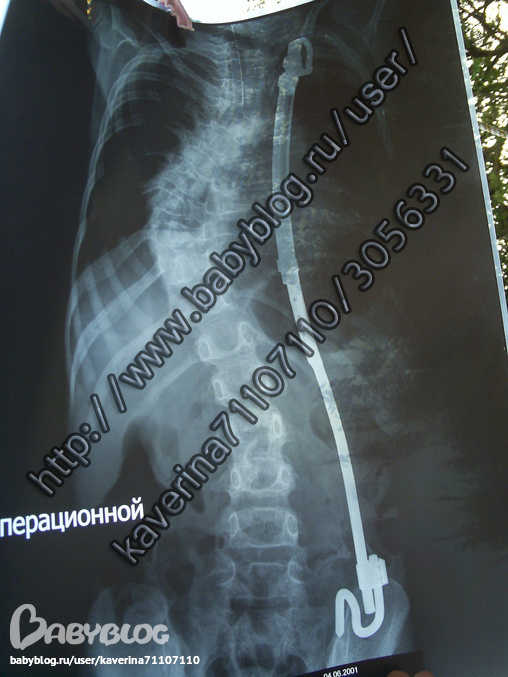 Итак сейчас у нас стоит "растущая" конструкция VEPTR,она немецкая,стоит около 400тыс.руб.Не знаю как сейчас,но на 2009г. такую ставили только в Новосибирском НИИТО. У меня есть официальные отказы из Питера.Институты Альбрехта и Турнера предлагали мне продолжать делать массажи и носить корсеты лет до 14ти.Ребенок в восемь лет был буквой зю,фоток нет к сожалению,не могла смотреть даже,не то что фотографировать(((((((( К 14 годам он мог просто умереть,т.к. внутренности сдавливало сильней и сильней,особенно легкие и сердце. Славик был 28й ребенок в России которому сделали эту операцию.выглядит это так