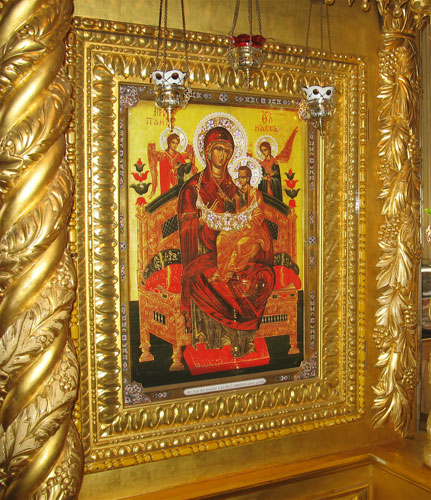 она обрела новую ризу и вернулась в монастырь,мы постояли на молебне, приложились к иконе и помазались. Очень не хотелось уходить,мужской хор это что то! Как они поют! весь храм расписан библейскими сюжетами и ликами святых,попав сюда забываешь,что за стенами бурлит еще какая то жизнь. Так и осталась бы там))но мирские заботы позвали обратно.