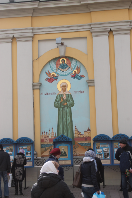 Меня, как находящуюся в особом положении, пустили без очереди. Правда, одна монахиня пристыдила меня, но, когда я выразила готовность идти по общим правилам, остановила и направила к мощам.Тут я попала в это небольшое помещение с огромным количеством людей, где охранник регулировал людской поток, приговаривая: "Молимся заранее, у мощей не задерживаемся". Трудно представить себе, СКОЛЬКО же людей за день успевает посетить святую Матрону. Тысячи...