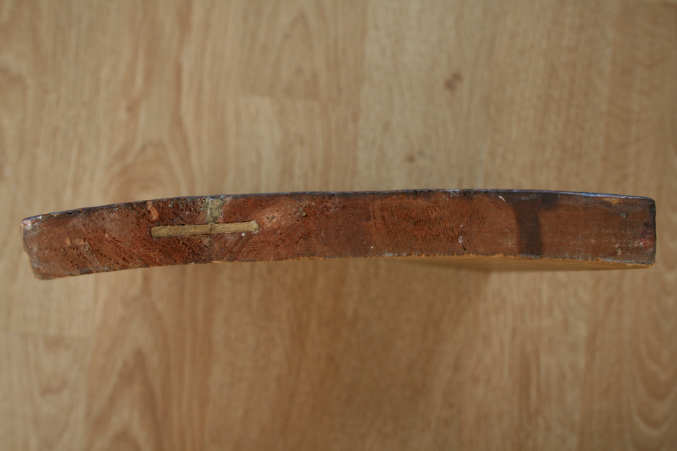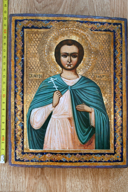 1. мч. Вонифатий, примерно 22х17 (она кривая). Икона храмовая, роспись по дереву, реставрировалась лет 7 назад (только роспись). Доска "волной", трещина вдоль всей иконы, скреплена скобой и гвоздиками.