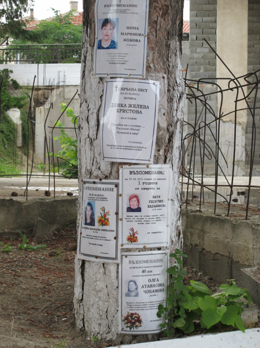 Это объявления о поминовении - на годовщину, 40 дней, или объявление о смерти. Мы сначала не поняли, когда увидели, думали, это какой-то специальный дом. Потом, когда увидели их везде - удивились, что люди вывешивают объявления, чтобы помянули их ближних, помолились о них. Я говорила мужу: "Надо же, какие дружные жители общины, наверное, в церкви на службе будет не протолкнуться. Ведь на 2000 жителей общины всего две церкви, одна из которых закрыта на реставрацию."
