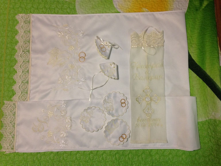 Венчальные аксессуары-это рушники (подножка, союзный или для икон), салфетки для свечей, венцов и колец с монограммами, а также мешочек для упаковки и хранения аксессуаров с монограммами и датой венчания, платки, косынки, пелерины ручной работы.