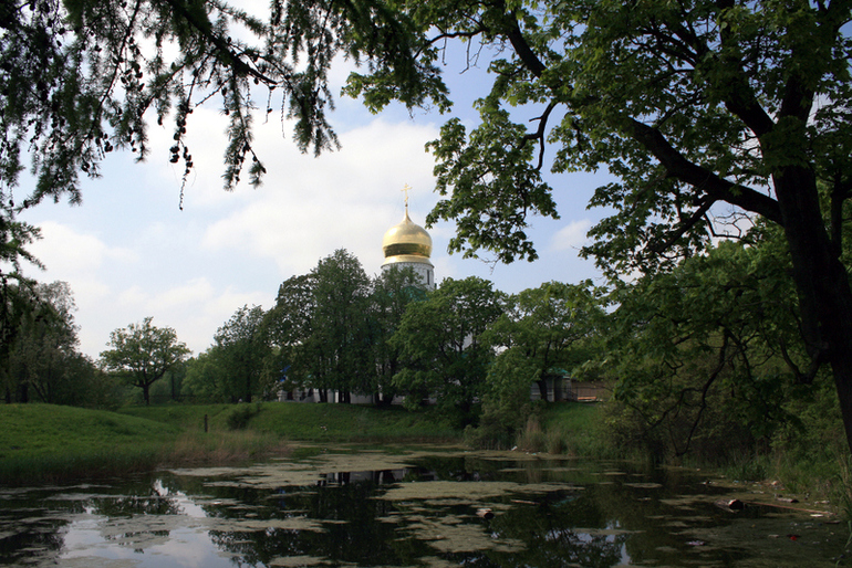 Сейчас сверкает позолотой. Очень интересно наблюдать, когда едешь в Пушкин в хорошую погоду. Самого собора не видно, очертания города тоже не угадываются, а купол сияет как путеводная звезда. Если не знать, что это, то и не догадаешься пока не подъедешь уже ближе. Как маяк Царского села)) Места рядом с храмом живописнейшие.