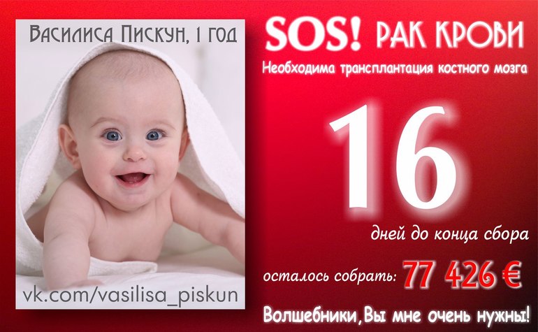 У малышки нет времени ждать. После очередного блока химиотерапии будет только несколько благоприятных дней для ткм, и к этому времени жизненно важно завершить сбор. Уже много собрано неравнодушными людьми, но сумма еще велика и нам не справиться без вашей помощи. Помогите посильной суммой - каждые 100 рублей важны! Расскажите людям о Василисоньке, может среди знакомых найдется человек, который сможет помочь девочке. Помолитесь о болящем младенце Василиссе.