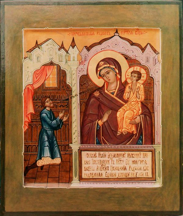 Один грешник имел обычай ежедневно становиться в своей комнате пред образом Божией Матери на молитву и воссылать Ей Архангельское славословие: Радуйся, Благодатная! Так и однажды, собираясь на грешное дело свое, зашел он по привычке в комнату и встал перед иконою Божией Матери. Но что это? Вот она на его глазах пришла в движение, лики Пречистой и Богомладенца предстали пред ним живыми, на руках, ногах и ребрах Младенца открылись раны и из них потоком потекла кровь. Увидев это, грешник от страха упал и воскликнул: