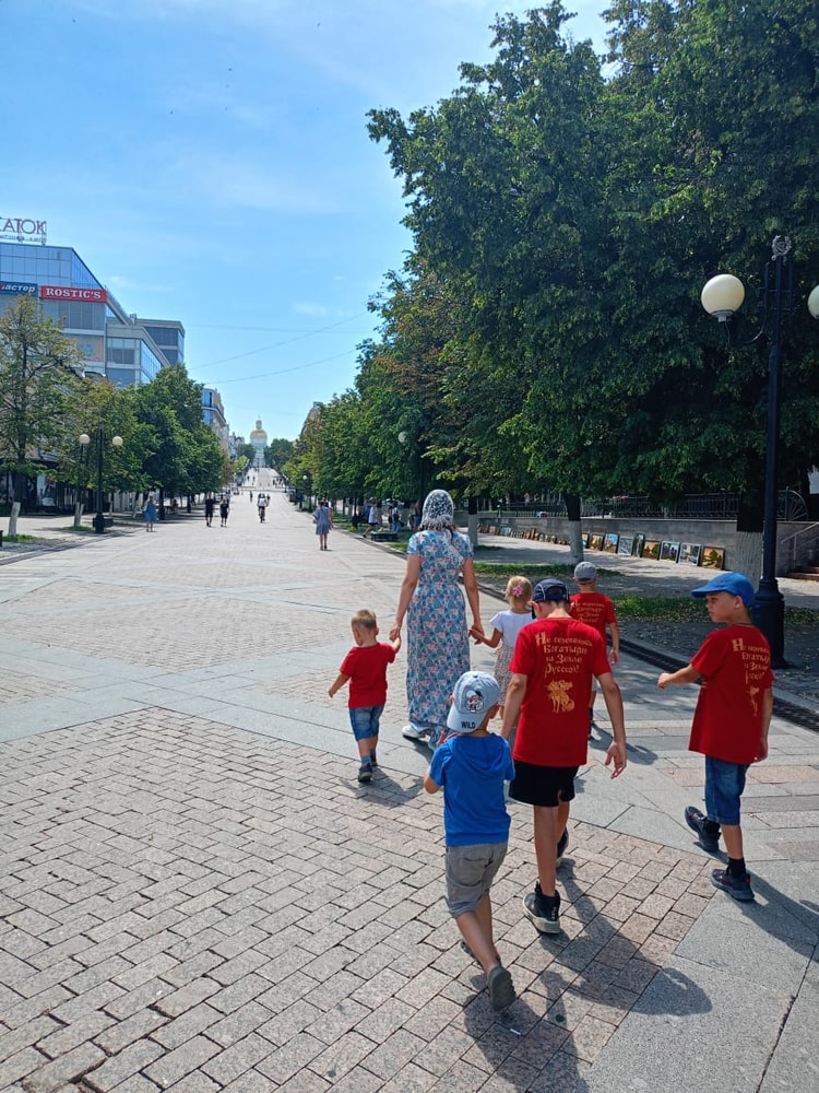 Навигатор завел нас в какой-то двор, где мы и припарковались. Дальше нужно было идти по пешеходному проспекту. Жара, никакой грозы не предвиделось. Проша орал не замолкая. В здание с кинотеатром- большой торговый центр- мы нашли вход не с первой попытки. Что ж поделать, неместные... Впритык успевая ко времени начала сеанса, немного на нервах с орущим Прошей и уснувшим в коляске Софроном, долго и муторно оформляли кипу билетов. Нам объявили, что с коляской в зал нельзя по соображениям пожарной безопасности, поэтому только что уснувшего малыша пришлось будить и брать на руки. Орущему Проше купили чупа-чупс, и на всех немного попкорна. Наконец, мы расположились в зале, заняли почти весь ряд. Фильм хороший, "На деревню к дедушке", дети смотрят с интересом. Прохладно, хорошо, а главное, пока все молчат. Проша занят чупа-чупсом, а Софрон - поеданием попкорна. На середине фильма Софрону надоело сидеть на месте. Сначала он ходил по нашему ряду и угощался попкорном у всех сидящих. В это время у Проши закончился чупа-чупс, и он начал хныкать. Хочу взять его к себе на коленки и с ужасом обнаруживаю, что он весь мокрый. Сменной одежды нет. Сережа не без раздражения бросил: "Пусть теперь так сидит". И я его понимаю, вспоминая, как недавно в зоопарке раз 10 этого Прошу высаживали, почем зря. Понимаю, что Софрону надо бы сменить памперс, и мы с ним выходим из зала.По возвращении пытаюсь уловить смысл фильма, но Проша начинает просить есть.Тем временем Софрон вышел в коридор и пополз вверх по ступеням. При попытке его поймать и привести на место, начинался крик с повизгиванием. Тогда я решила пойти с ним вместе на самый верх. Мы с ним сели на последний ряд и продолжили просмотр. Но через несколько минут в нашем направлении двинулся Проша. Ему понравилось гулять по ступенькам, и он немного отвлекся. В общем, фильм мы досматривали втроем на последнем ряду. Слава Богу, он закончился, и мы вышли на жаркий проспект в поисках еды.