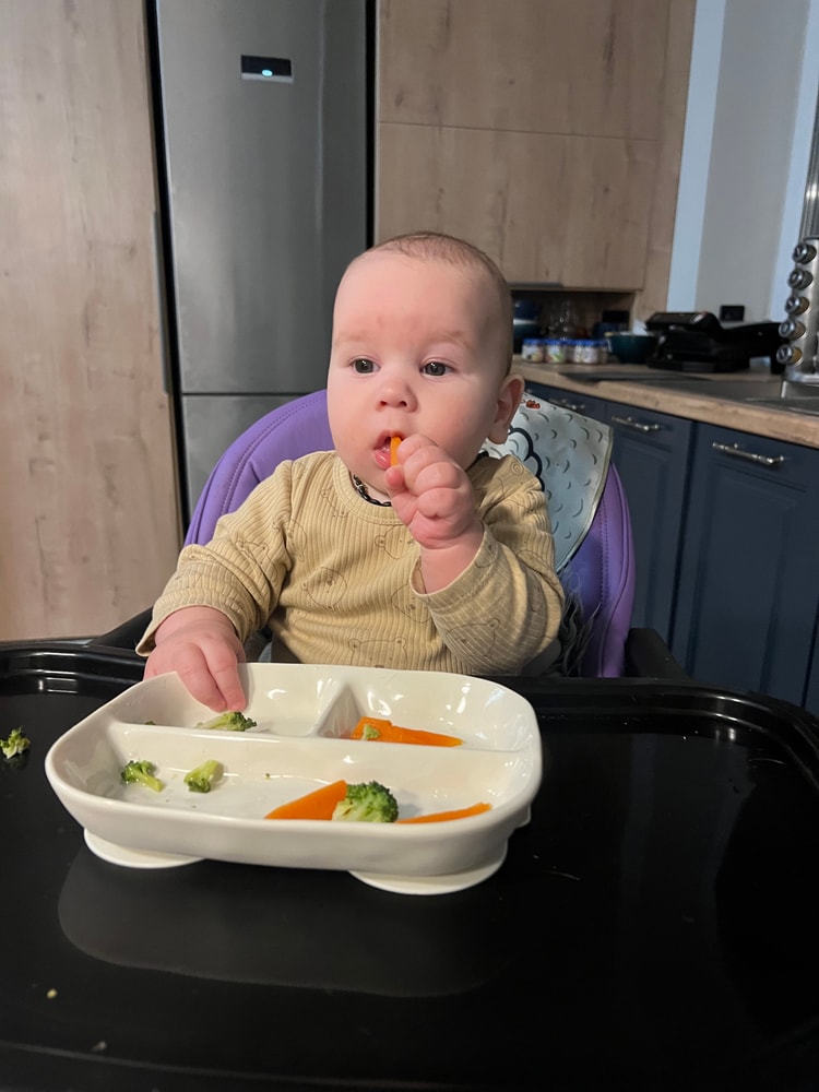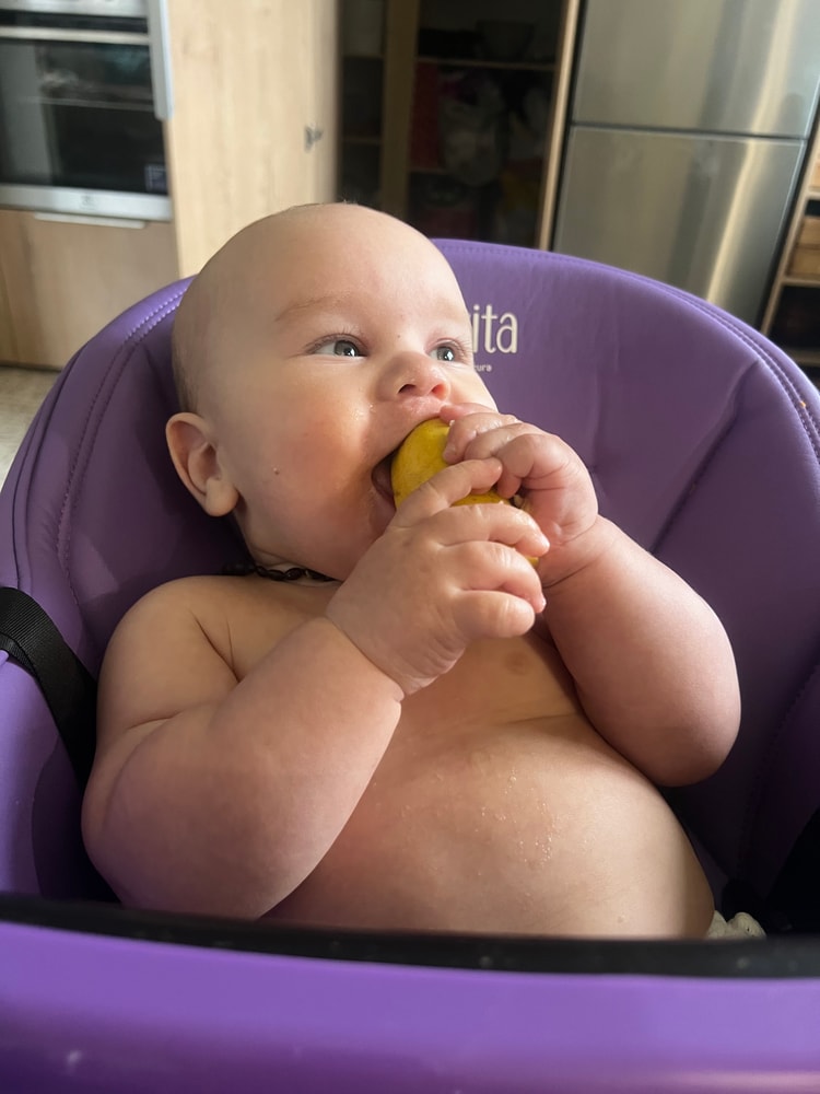 Итак, у нас идет 3 неделя прикорма (начали в 5.5). Начали мы, о ужас, с банана в кафе, утащенного с маминой вафли 😁