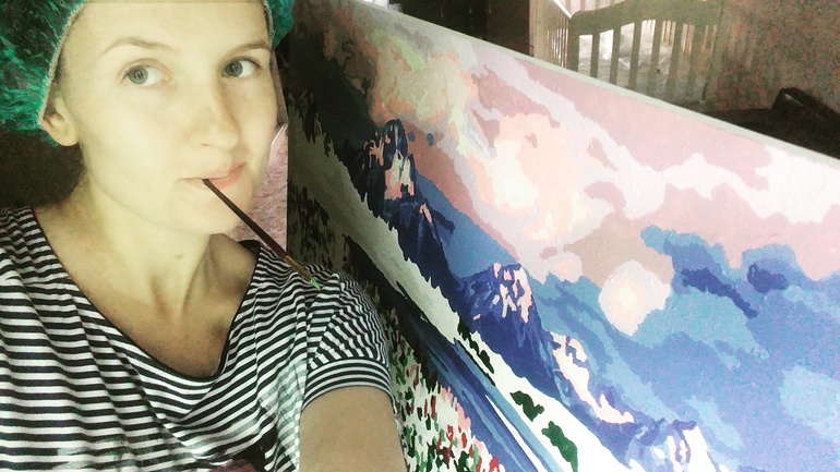 Маска для волос под шапочкой превращается в беретик, и вот на холсте мы что то твориииим:) (фото ниже), у вас тоже ливень стеной?