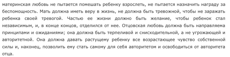 Далее цитата об идеальной, с точки зрения Фромма, материнской и отцовской любви: