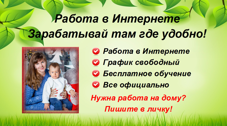 Всем привет) Я могу ответить на данный вопрос. Приглашаю на подработку в свободное время в сети Интернет, поэтому больше подходит мамам (или папам) в декрете, а также домохозяйкам и студентам в академическом отпуске, для граждан РФ от 18 лет) Оформление официальное.От Вас требуется обучаемость и желание работать! Помощь 24 /7 в дружной отзывчивой команде! За подробностями обращайтесь в личку или оставляйте комментарий.