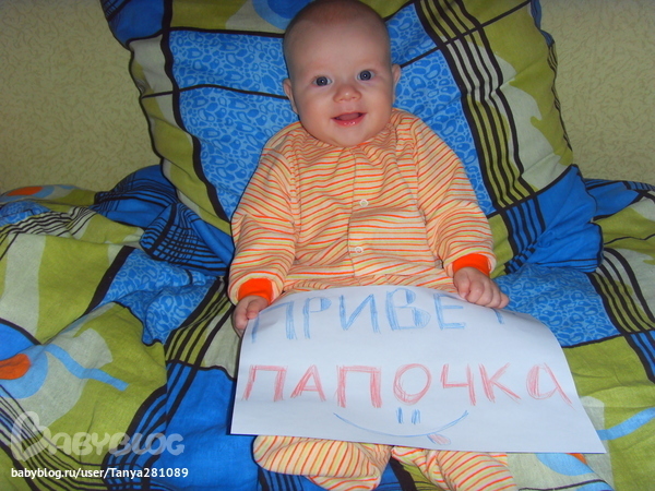 Решили мы с сыночком папе передать привет! Нарядила своего мальчика, на листе А4 написала послание и сфотографировала. Послала фото мужу через ммс, он в это время был на работе! Получив фотографию, он был очень рад!