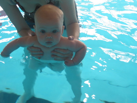 С нами в группе были ещё детки даже младше чем кнопик но они через мин 15 начинали плакать и их пришось доставать из воды..так потихоньку остались только мы с кнопиком ещё одна мамочка с ребятёнком...ну и конечно наша учительница...)))