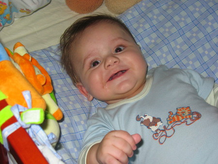 Итак, каковы же наши результаты: весим 8,700 кг (+ 200 гр.), рост 72 см. Сделали вторую АКДС. Сами так и не сидим, только с поддержкой, не ползаем, с живота на спину не переворачиваемся. Ну ничего, всему своё время! Зато мы с характером!