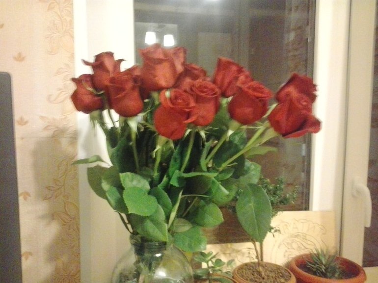 А я вся покраснела, стаю чуть не плачу, и радость и стыд. Как я могла забыть, всегда его поздравляла делала подарки, а тут, на тебе и забыла. Конечно извинилась, сказала честно, что забыла. Что в голове только предстоящее посещение врача (наблюдаюсь в центре планирования семьи). Благо у меня муж не обидчивый и все понимает. Люблю его всем сердцем! Вот какие теперь у меня дома розы стоят.