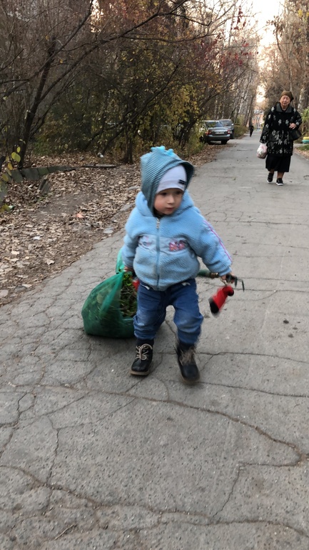 Потом случился долгожданный первый (и, к сожалению, единственный на сегодня) дневной сон. После сна пришла массажистка и сделала парню массаж. Вся обязательная программа на сегодня завершилась и мы пошли на улицу - я решила показывать пример трудом и устроила для нас с Владом небольшой субботник около подъезда. Малыш отлично воспринял идею, ходил со мной то с грабельками, то с лопаткой, по моей просьбе носил фантики в общую кучу мусора 😊 потом пришло время всю собранную листву тащить на мусорку. Что полегче я погрузила в пакет и показала Владу как надо его тащить по земле. Честно говоря думала и полпути не протащит, но на мое удивление он потащил и дотащил до мусорки, а потом ещё и ещё! Сам вынес 3 пакета опавшей листвы!