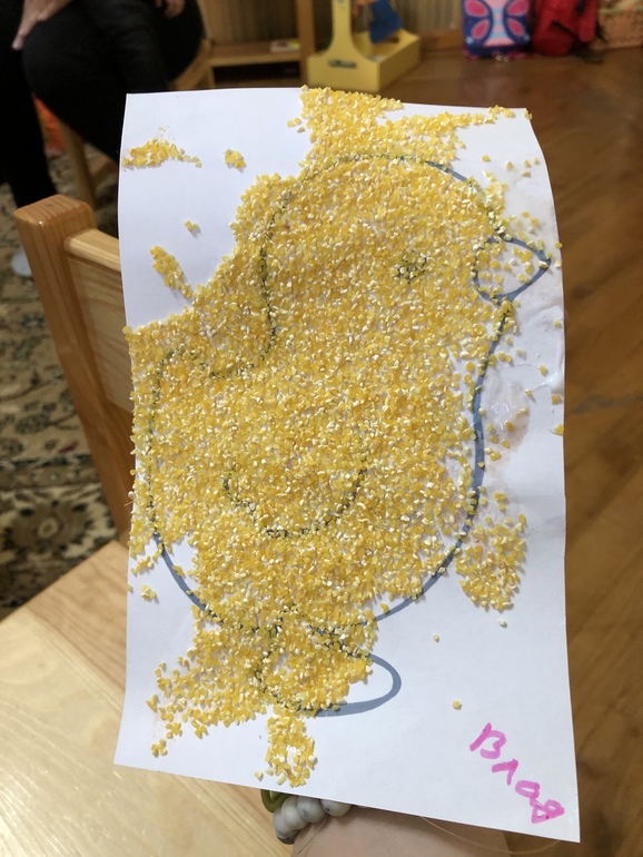 Надо было не ехать в детский сад, но я собрала нас с ним, так как особых причин не идти пока не видела ))) В саду началась подготовка к новогоднему утреннику, учили новые песни и танцы. А мой красавчик половину песен проревел - взял колокольчик и тут же бросил, этот колокольчик поднял другой мальчик и уж очень это не понравилось Владиславу Антоновичу. В общем повод закатить истерику был найден 👌 В комнате Монтессори дело пошло на лад - наконец освоена шнуровка. Потом преподаватель посадила всех на творчество , сегодня задача была клеем ПВА намазать изображение цыплёнка, а потом засыпать жёлтым пшеном и цыплёнок должен стать жёлтеньким. Владу очень понравилось возить кисточкой с клеем по картинке и не только. А потом, когда дело дошло до пшена, в пшене были цыплёнок, стол, я, Влад, Соседка Влада , мама соседки Влада, половина класса... 🙈 кстати, вот и наш цыплёнок: